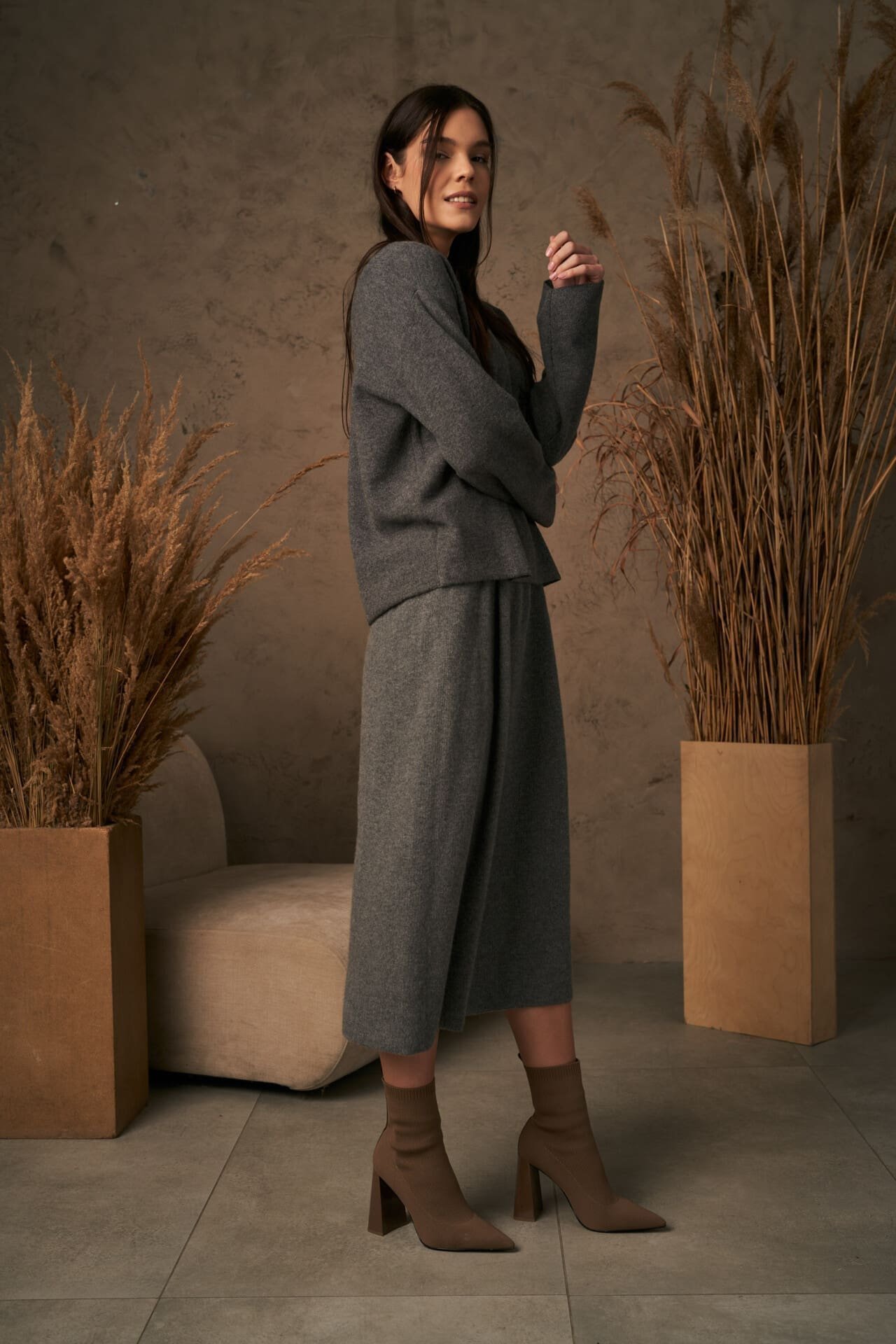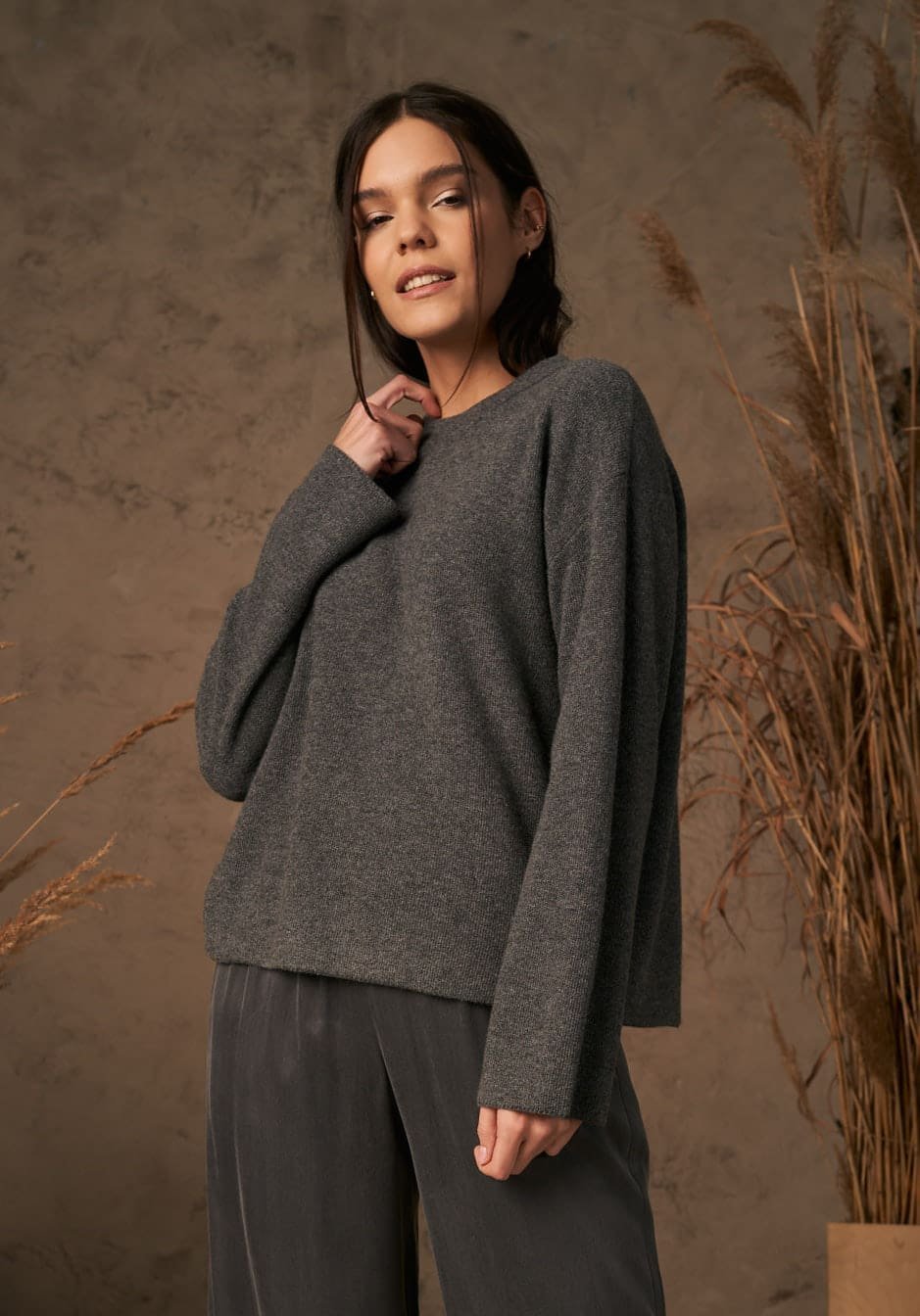 Šiltas ir jaukus kašmyro megztinis. Laisvo silueto, apvalia apykaklė ir ilgomis rankovėmis.