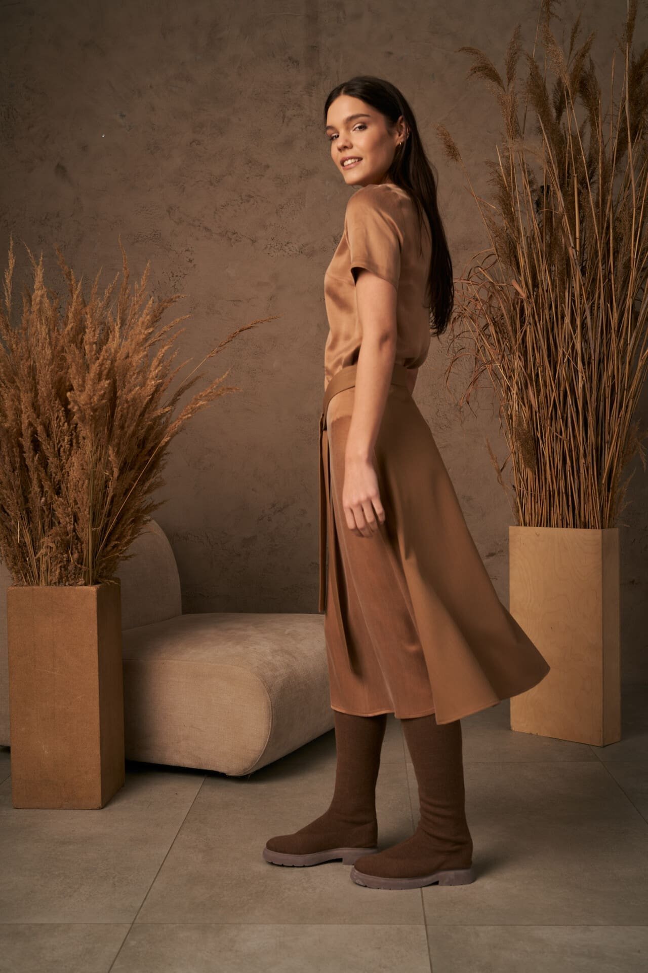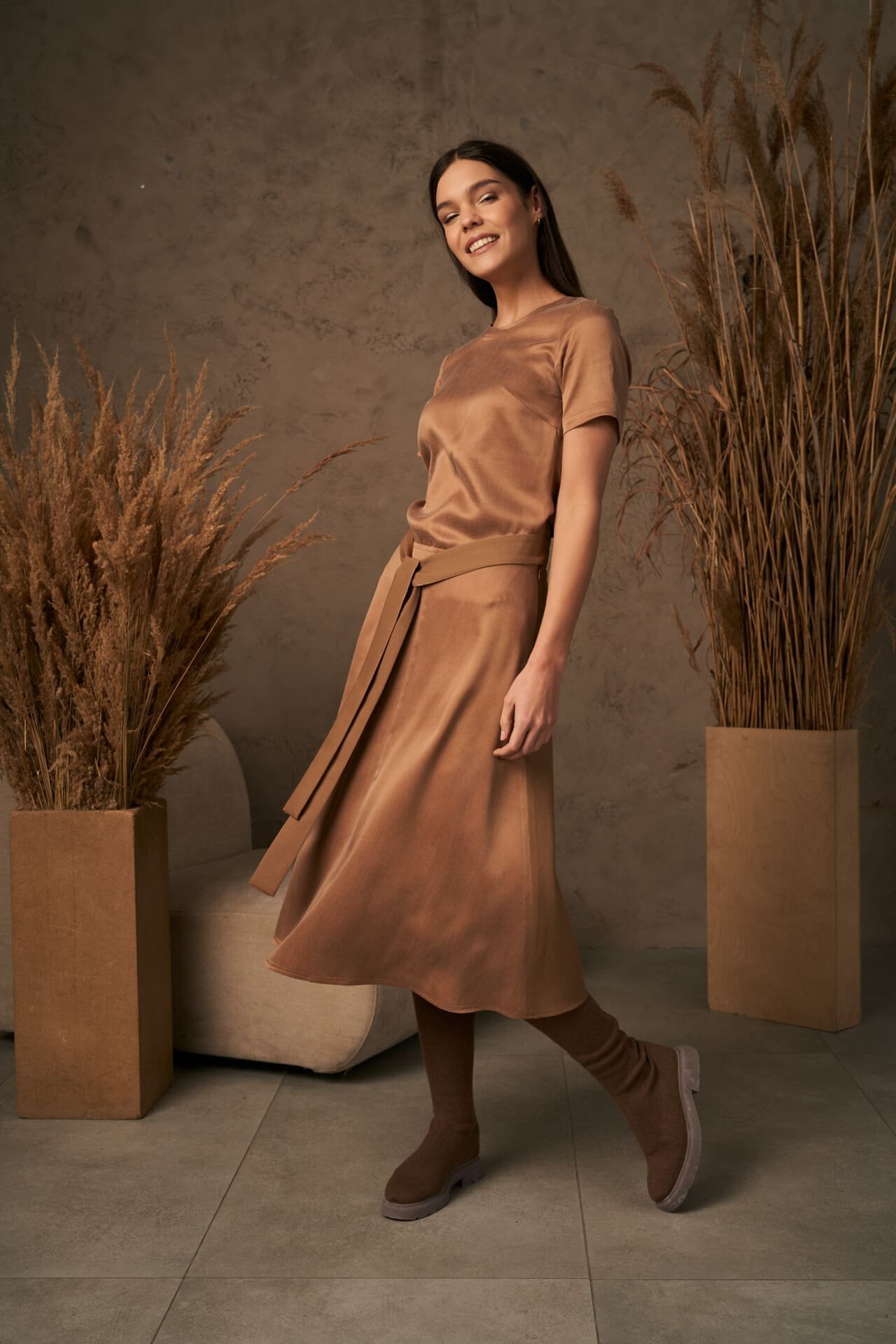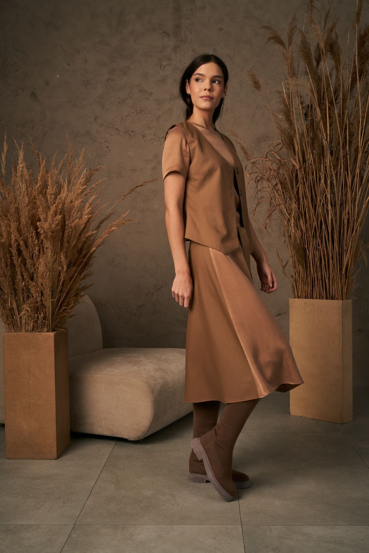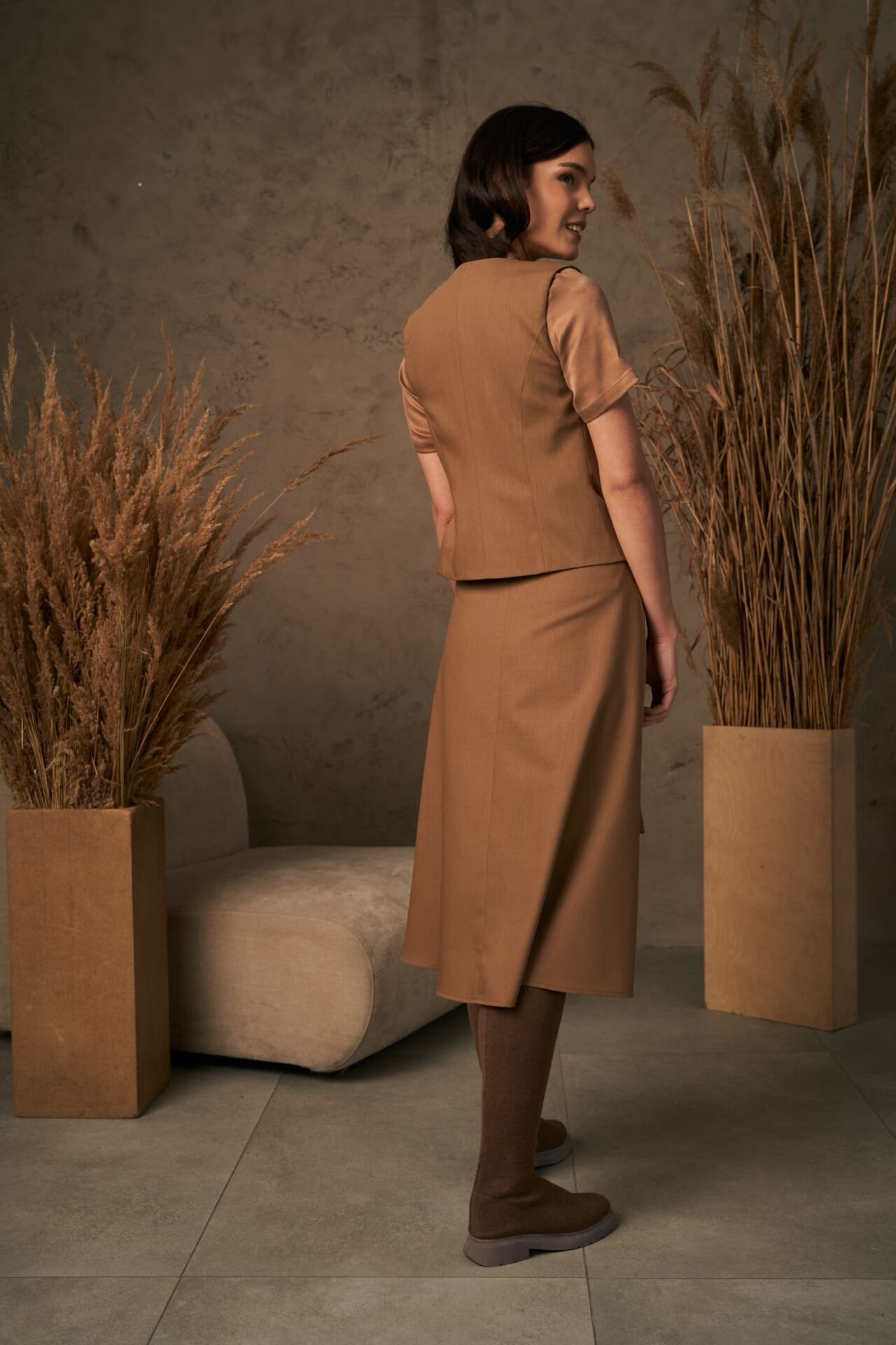 Dviejų dalių sijonas. Gali būti dėvimas skirtingais būdais ir variacijoms.  Susegamas slaptu užtrauktuku ir sujuosiamas diržu. Stilingas midi ilgis.