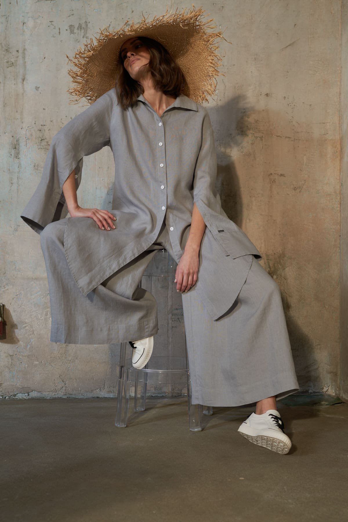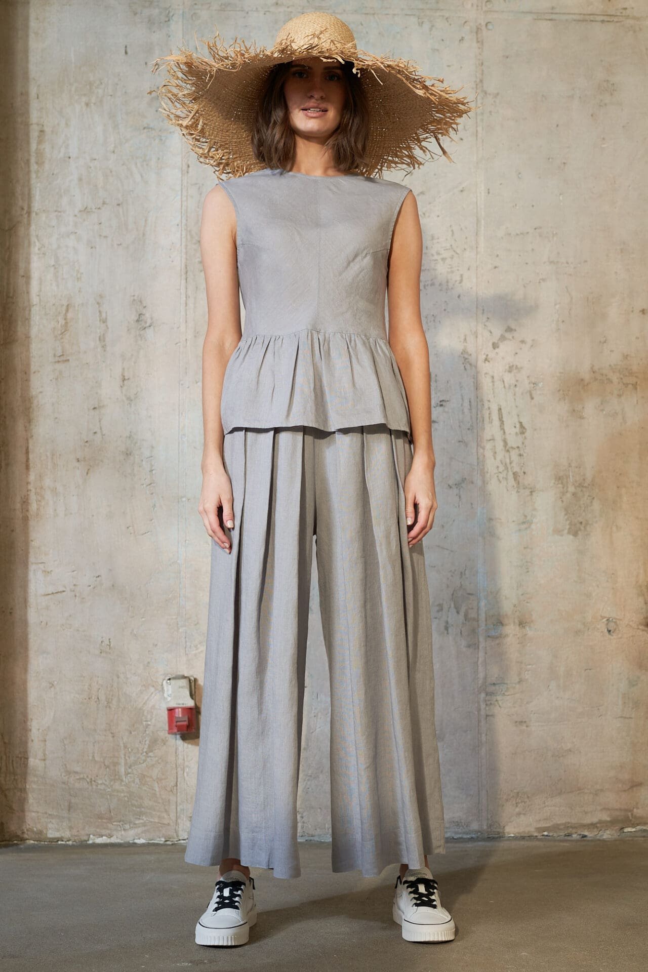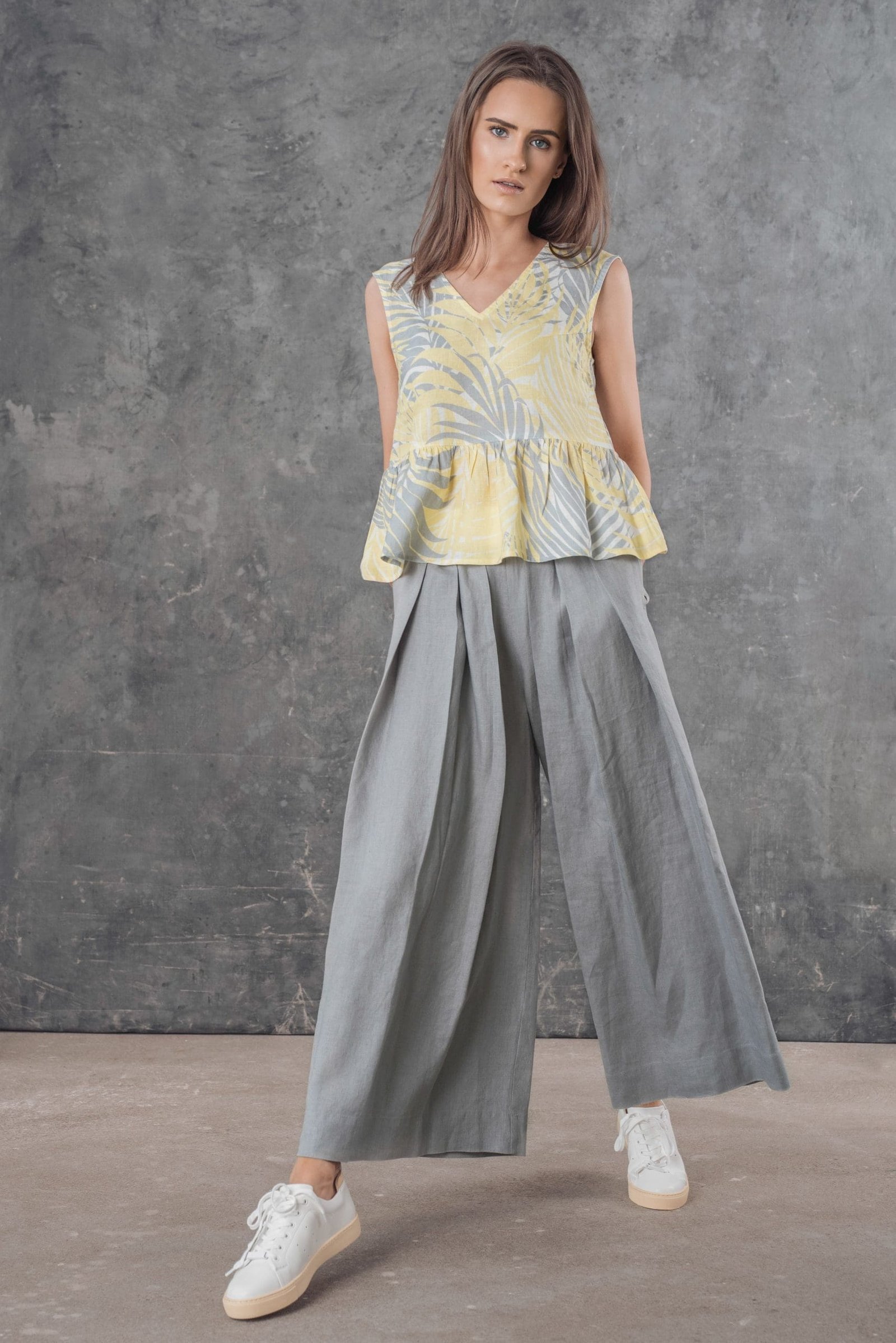 Pilkos lininės kelnės su klostėmis