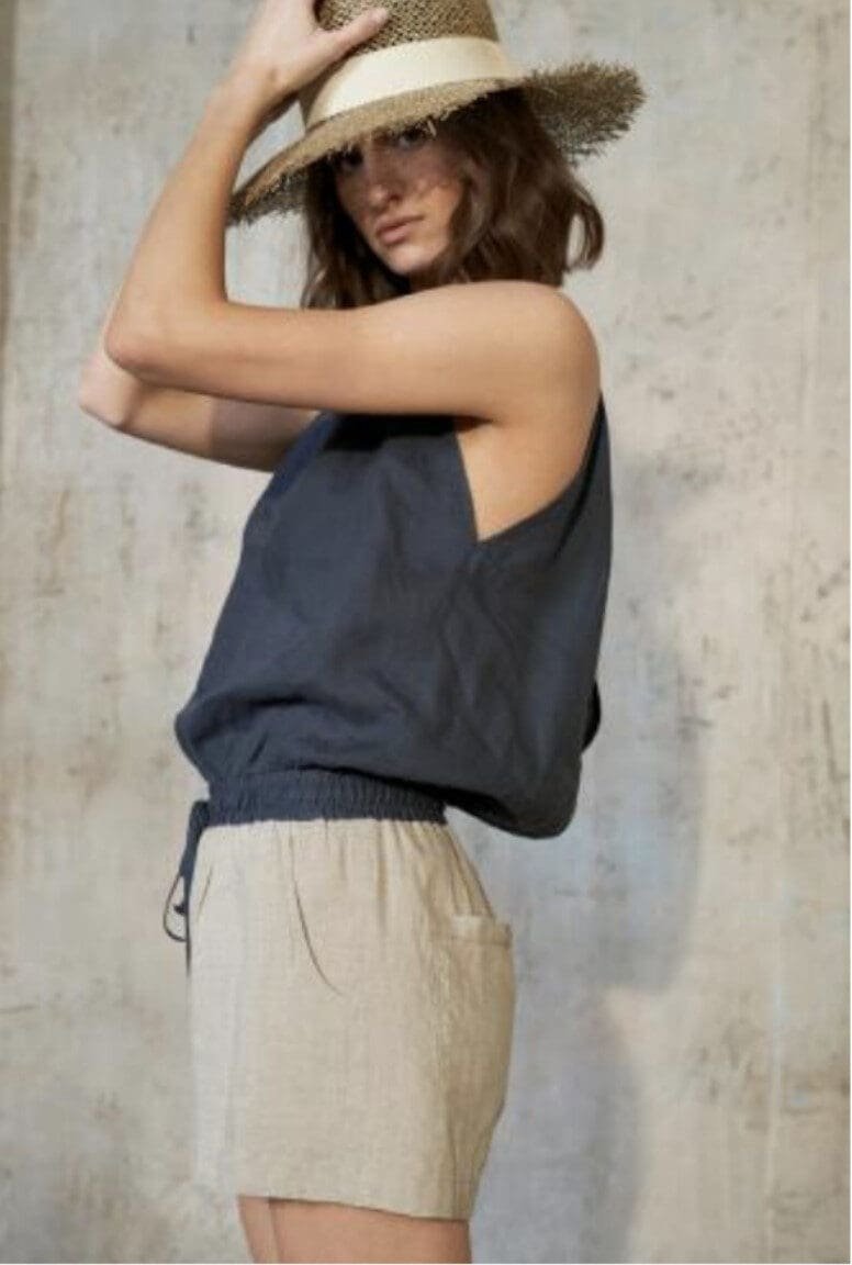 – užsegimas gaminio pečių linijojeGaminio sudėtis: 100% linas, kuris atitinka OEKO TEX klasės standartą bei neturi kenksmingų pridėtinių medžiagų