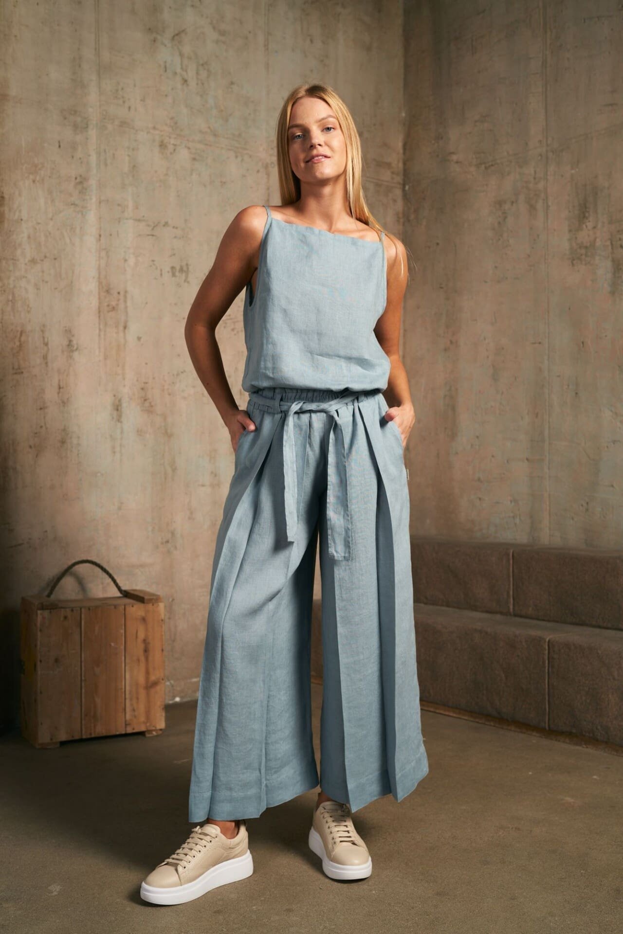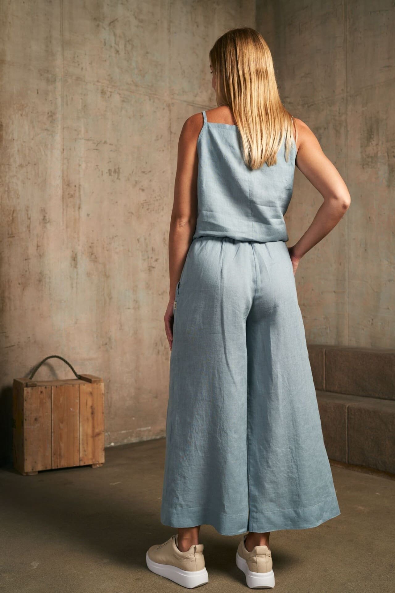 Stilingas per pečius suvarstomas lininis kombinezonas