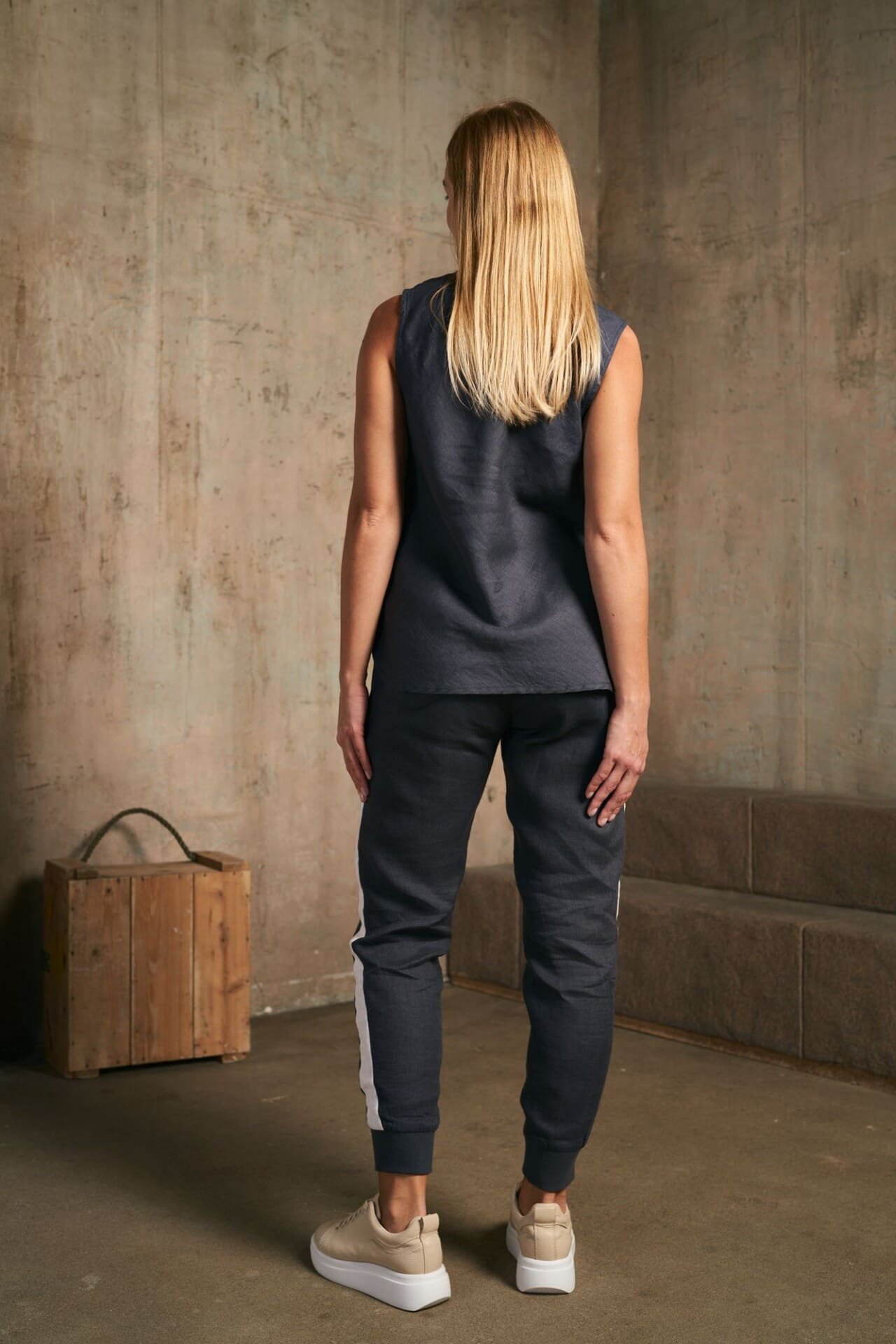 Laisvo silueto lininė palaidinė deranti prie įvairių vasaros įvaizdžių, kurios minimalistinė akcentinė juostelė gaminio priekyje stilizuoja.