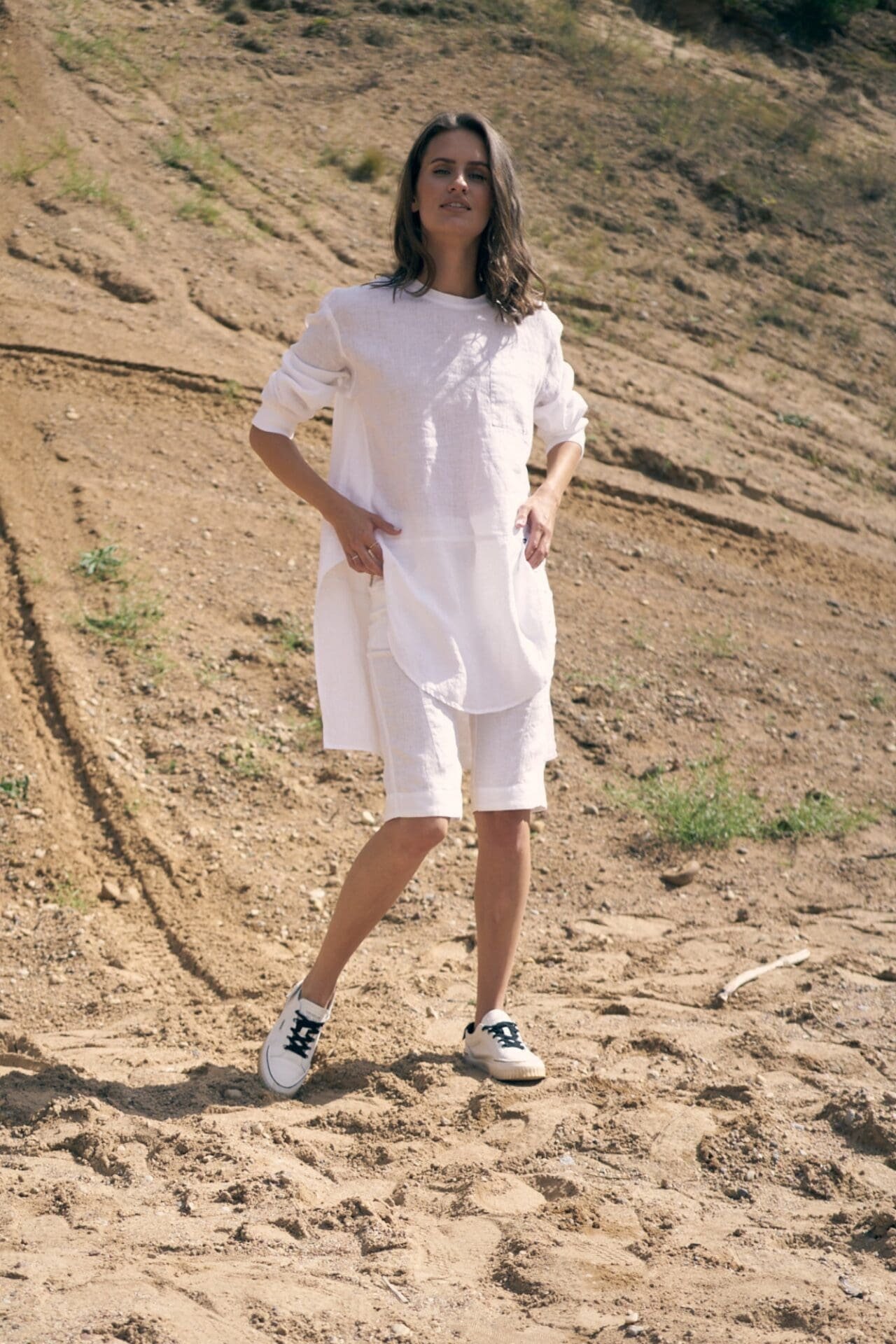 Pusilgiai, pagal figūrą suformuoti lininiai šortai. Patogus ir šiuolaikiškas pasirinkimas kasdienai.