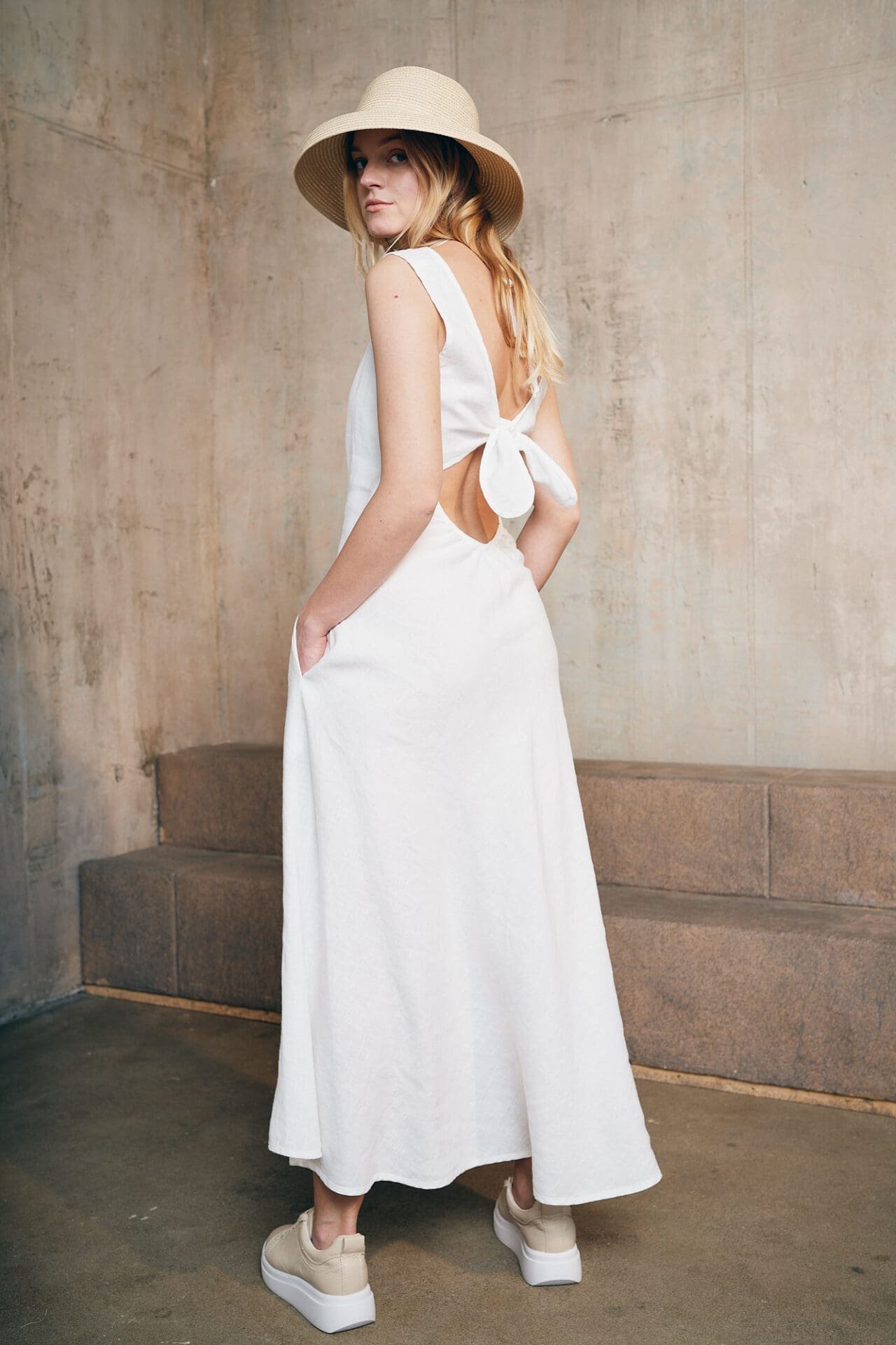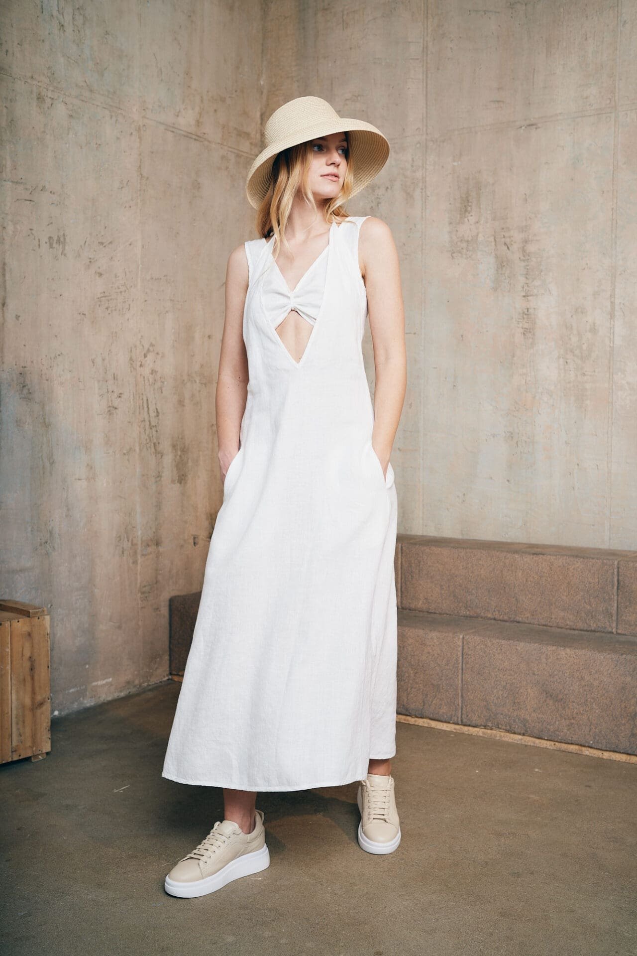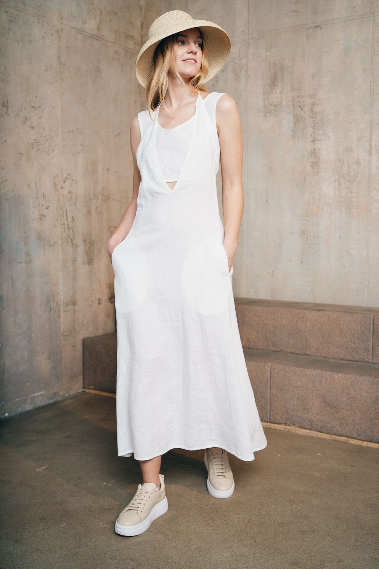 Ilga, atvira dviejų dalių lino suknelė. Suknelės dalys reguliuojasi, todėl lengvai galima prisitaikyti jas prie kiekvienos moters kūno linijų. Taip pat suknelės detalių pagalba, galima formuoti atviresnį arba uždaresnį suknelės įvaizdžio variantą.