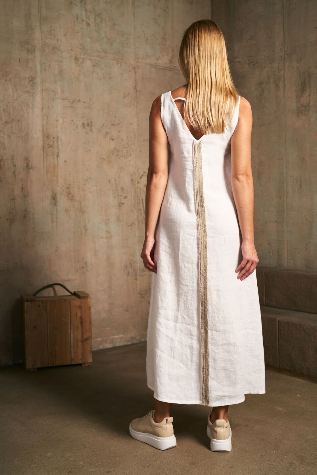 – V formos apykaklės tiek priekyje tiek gale, todėl suknelė yra be užsegimo