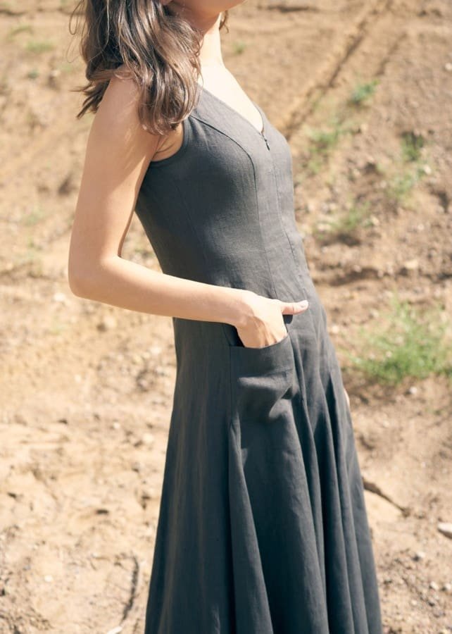 Įliemenuota, V iškirptės platėjanti ilga lininė suknelė
