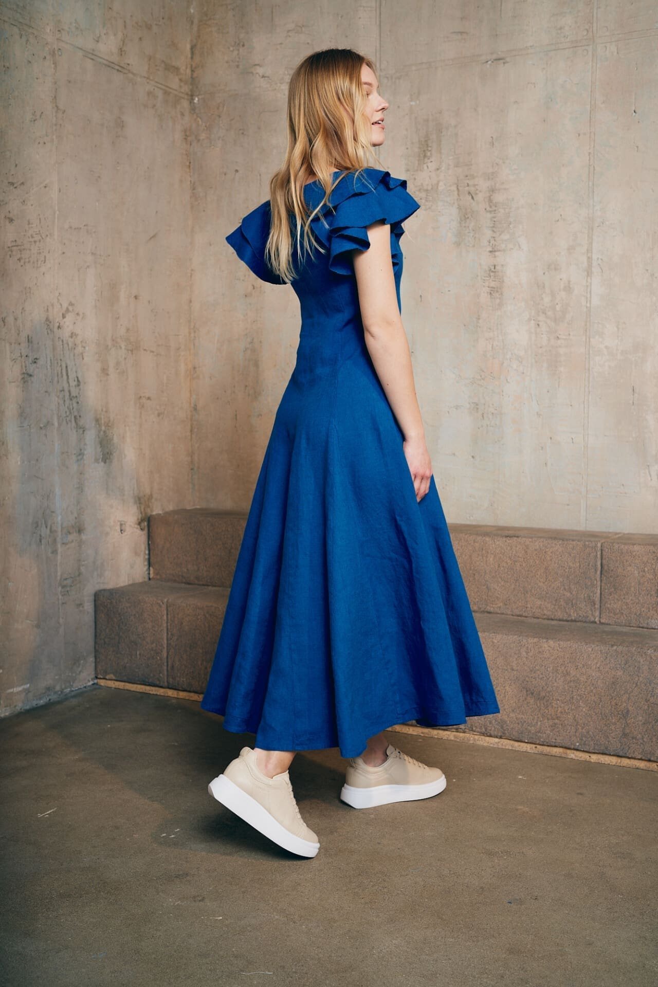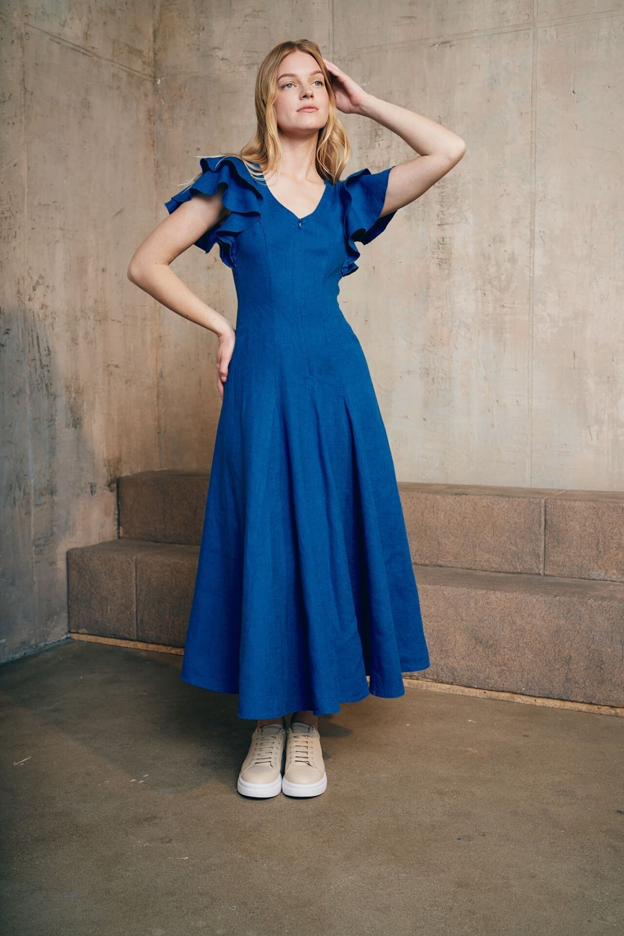 Itin romatiška, pabrėžianti moterišką siluetą lininė suknelė.