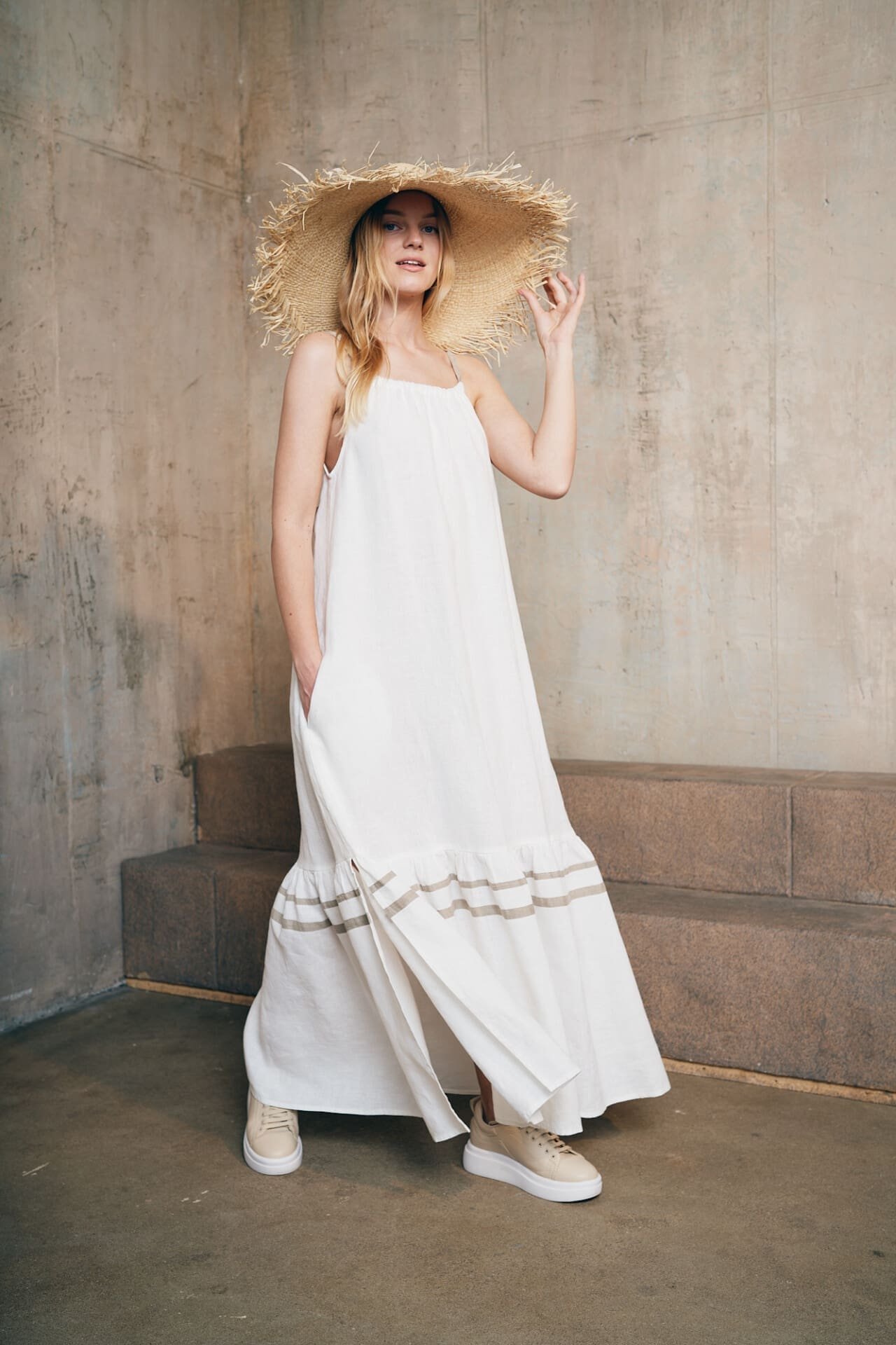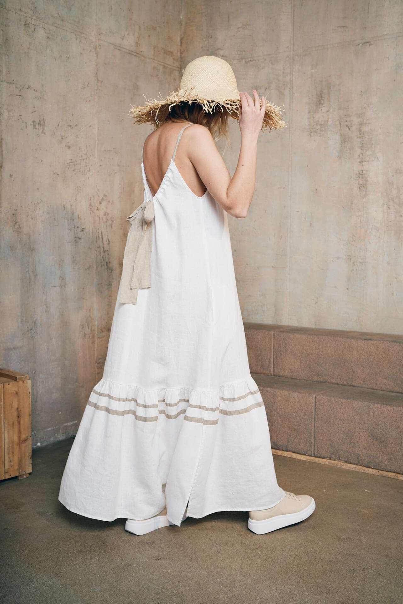 Ilga surišama kaspinu lino suknelė