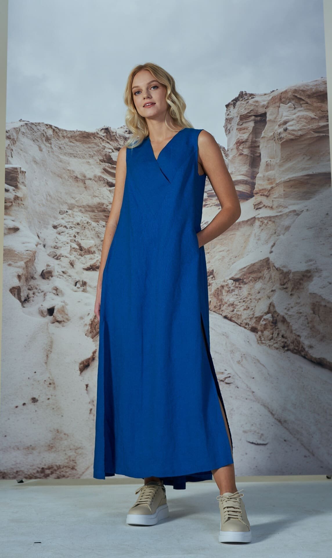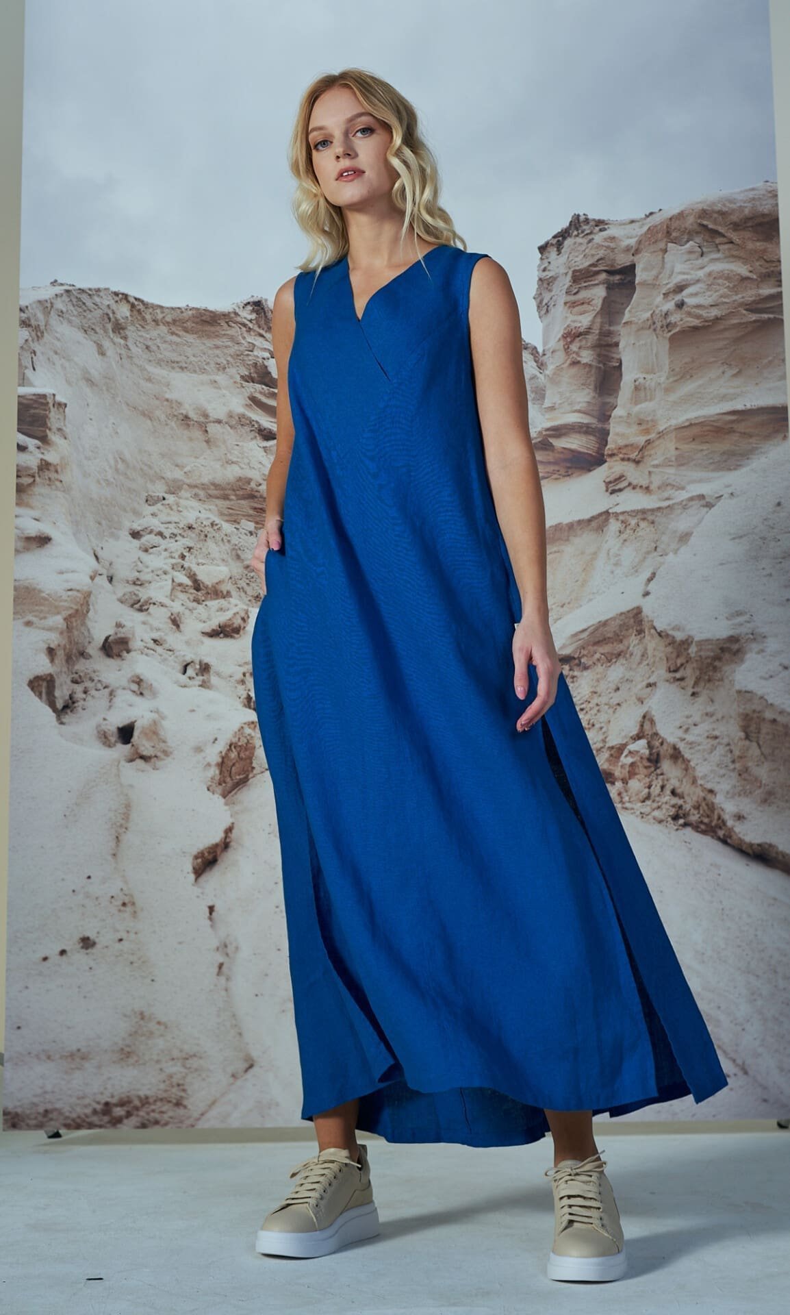 Ilga su skeltukais šonuose lininė suknelė